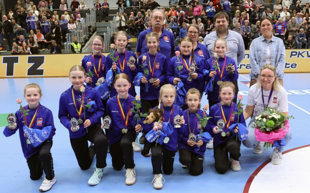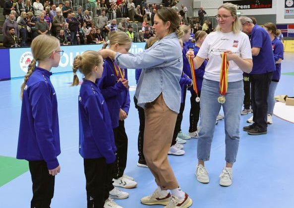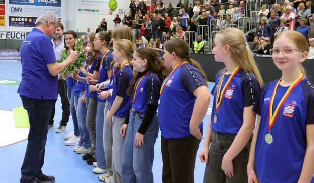 Während der Hallensprecher vor großer Kulisse die Namen der w D Jugendmannschaft verlass, konnte durch den Vorsitzenden vom Förderverein Ralf Dawitz sowie Vorstandsmitglied Nina Lohmann und Jan Schwensfeger vom Präsidium der HSG Blomberg Lippe eine Rose und die Glückwünsche zum Erreichten an die Kinder und Ihre Trainerinnen Sylvia Cheikh Mozssa und Lina Kühne übergeben werden.